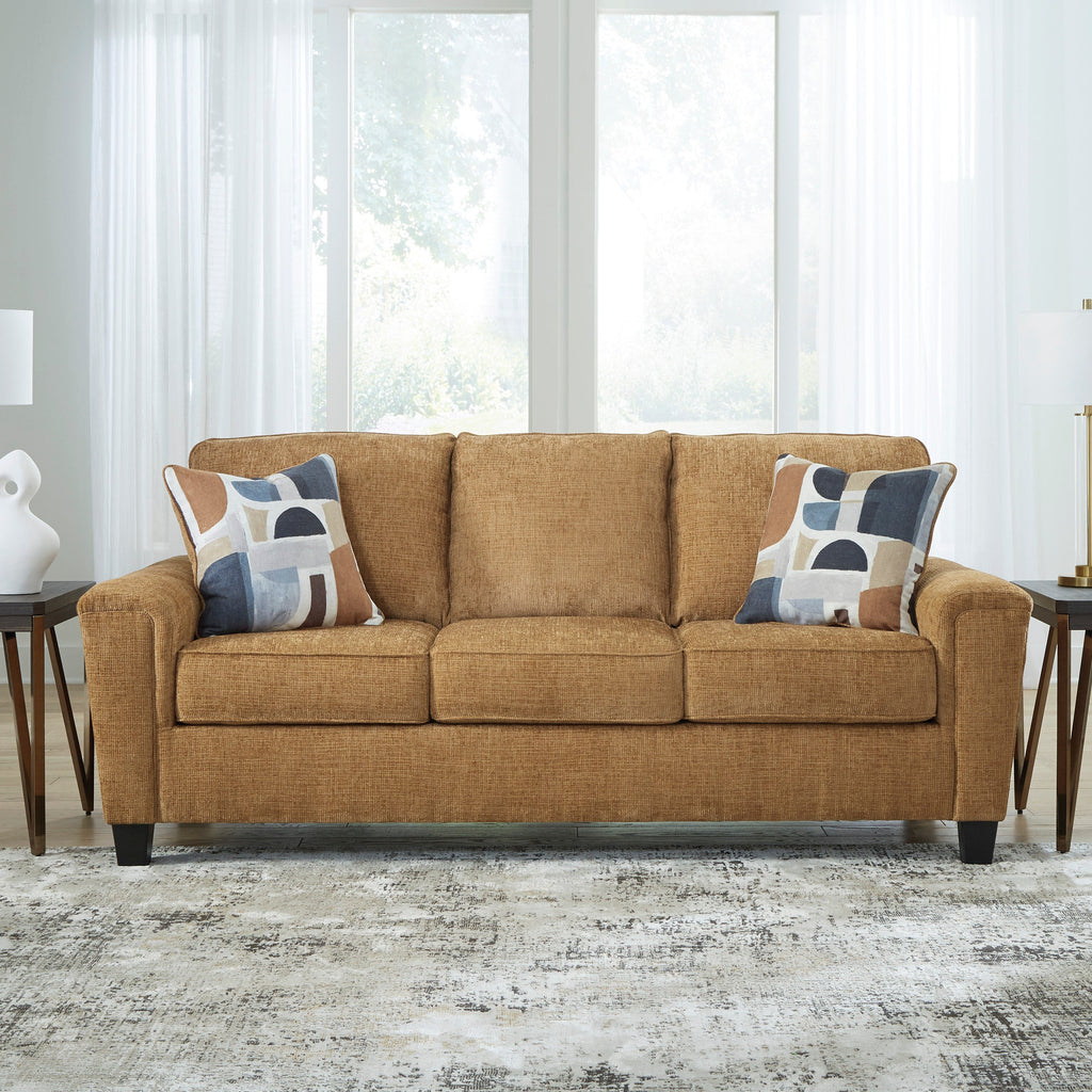 There’s something about this loveseat that’s so easy to appreciate. Maybe it’s the plush upholstery and comforting earthy tone, eager to support your quest for total relaxation. Perhaps it's the modern flair of its simple lines, tapered legs and abstract-patterned pillows. Whatever it is that appeals to you, this is a piece you're gonna love.