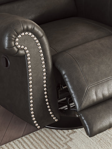 Everyone can have the best seat in the house with this swivel glider recliner. Its nailhead trim puts the finishing touches on the traditional roll arms you love. The recliner's comfy, durable cushions—wrapped in a rustic yet sophisticated faux leather—keep you feeling relaxed, while its turned legs show that style and quality flow from top to bottom. Plus the smooth reclining motion and 360-degree swivel keep you in the flow of conversation.