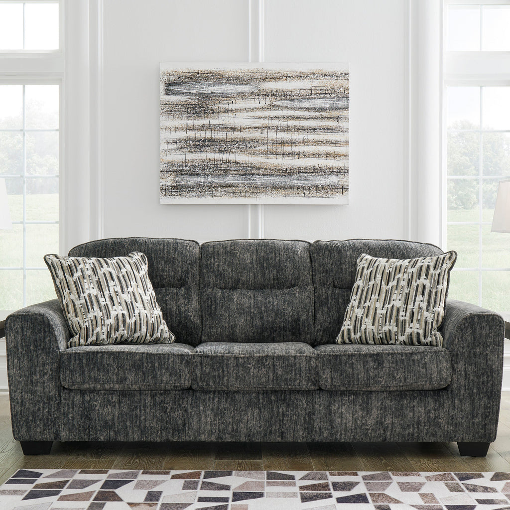 This sofa speaks to those drawn to fresh, contemporary style with richly neutral appeal. Subtle and sophisticated, the plush upholstery and dark tri-block legs are a natural complement for so many color schemes. Two accent pillows make the seating even more welcoming. Curling up on this sofa to enjoy a night in is never out of the question.